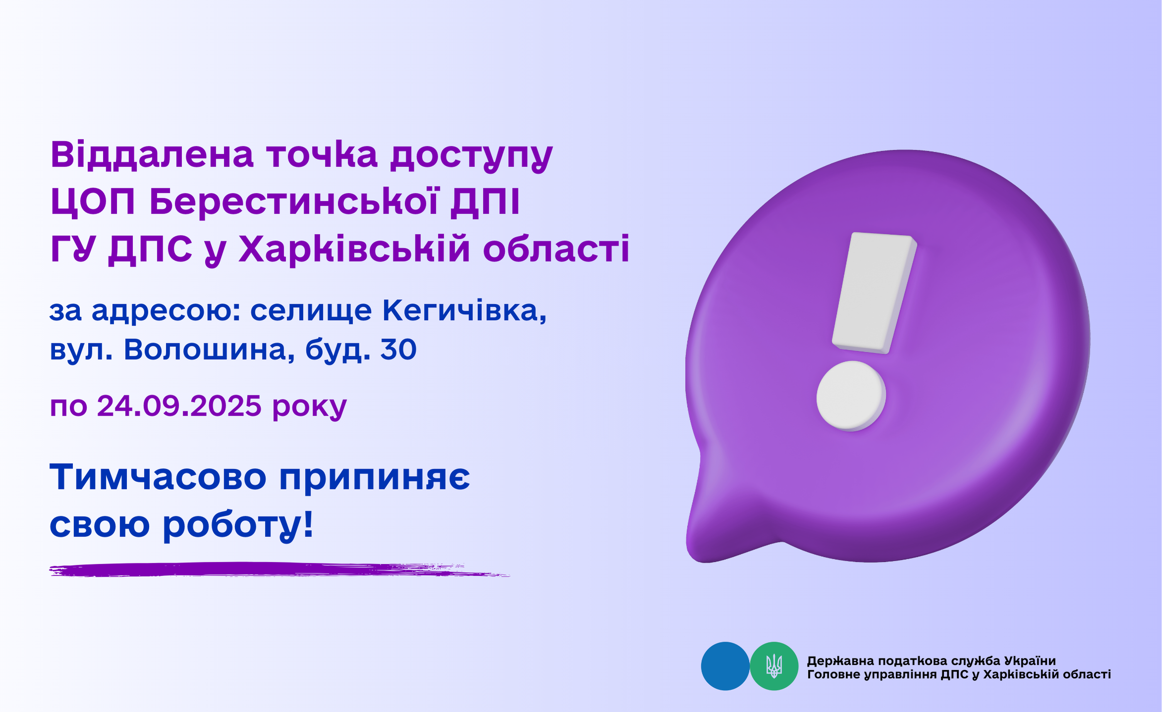 Точка доступу ЦОП Берестинської ДПІ тимчасово припиняє свою роботу!