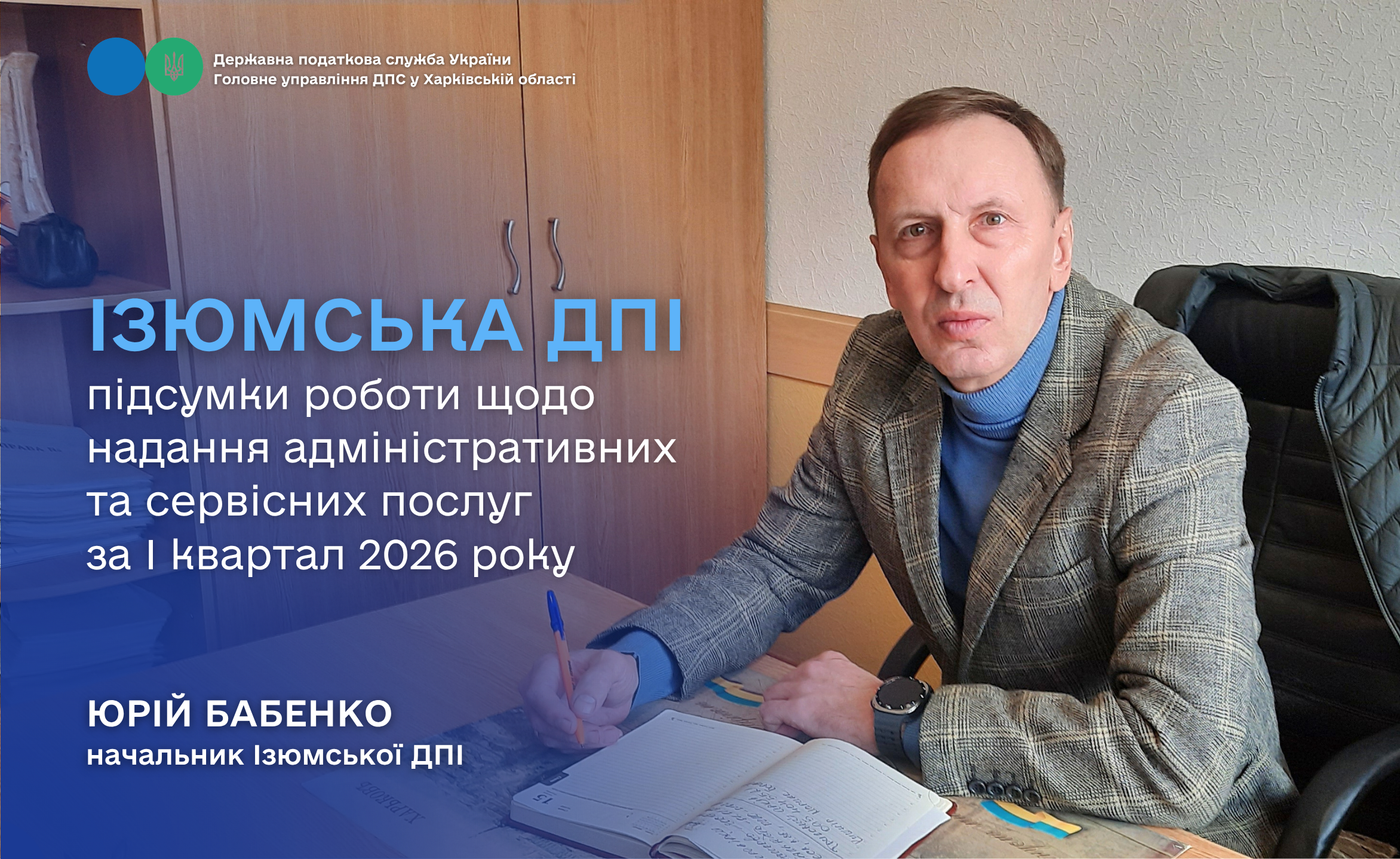 Крім того, за січень-березень 2026 року фахівцями Ізюмської ДПІ зареєстровано 26 реєстраторів розрахункових операцій, 144 програмних реєстраторів операцій, 76 книг обліку розрахункових операцій та 39 розрахункових книжок. Видано 402 витяги з реєстру платників єдиного податку, 12 витягів з реєстру платників на додану вартість, 18 довідок про підтвердження статусу податкового резидента України та 29 витягів з Реєстру неприбуткових установ та організацій.