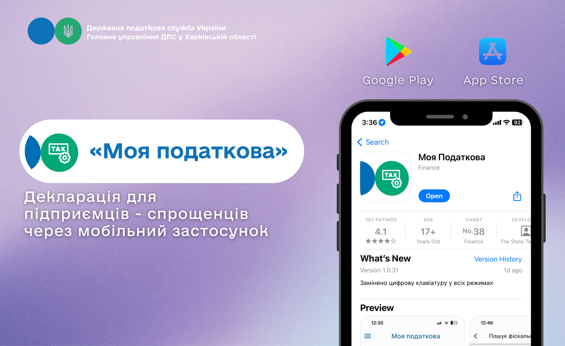 Головне управління ДПС у Харківській області повідомляє, що фізичні особи – підприємці, які застосовують спрощену систему оподаткування (1-3 група), мають можливість за допомогою мобільного застосунку «Моя податкова» подати податкову декларацію платника єдиного податку.