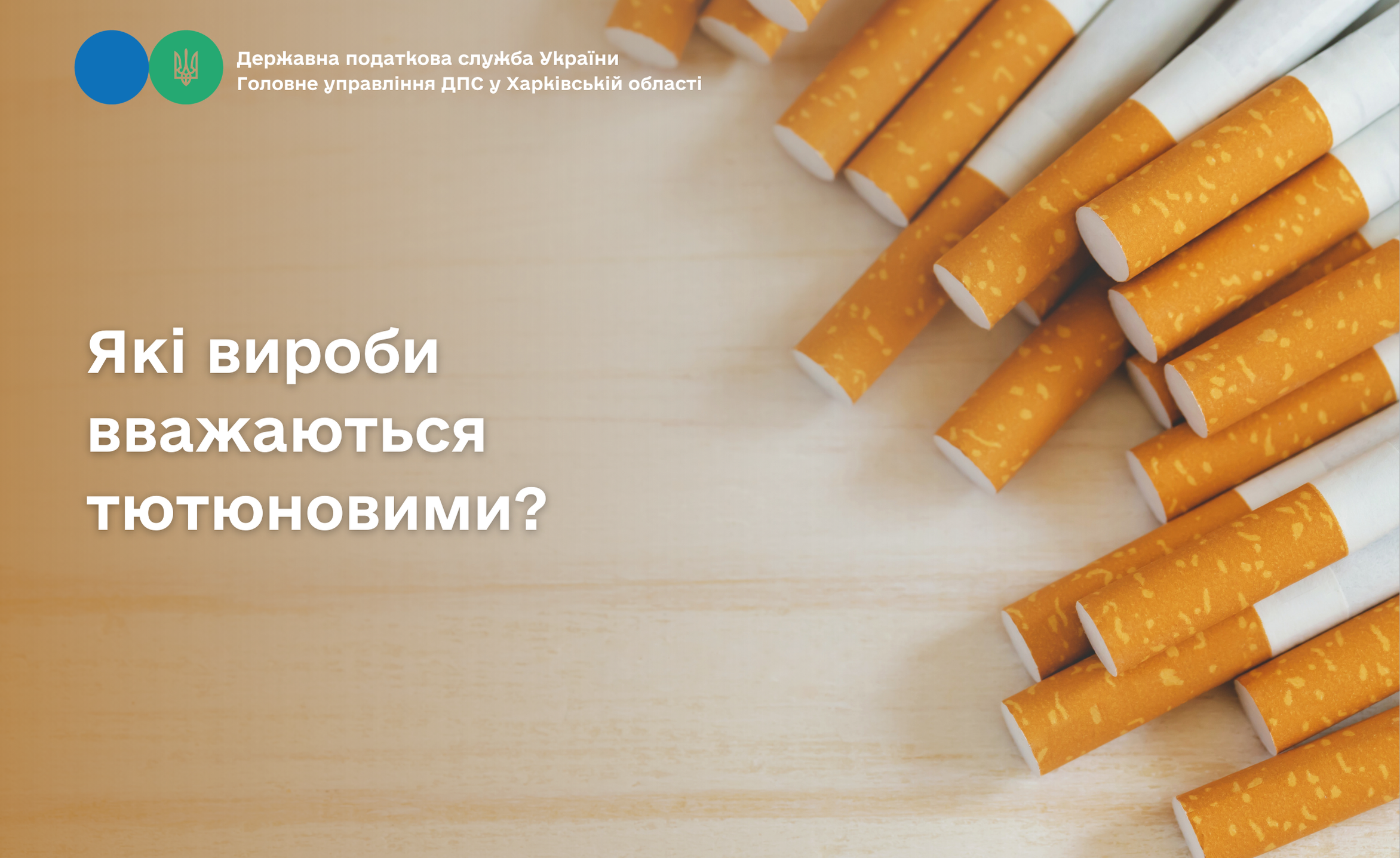 Головне управління ДПС у Харківській області інформує, що відповідно до п.п. 14.1.252 п. 14.1 ст. 14 Податкового кодексу України тютюнові вироби – сигарети з фільтром або без фільтру, цигарки, сигари, сигарили, а також люльковий, нюхальний, смоктальний, жувальний тютюн, махорка та інші вироби з тютюну чи його замінників, інші відмінні від рідин, що використовуються в електронних сигаретах, нікотиновмісні продукти, їх замінники для куріння, нюхання, смоктання, жування чи вдихання без горіння шляхом нагрівання.