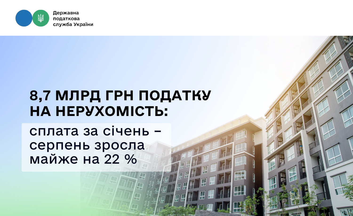 Власники нерухомості сплатили цього року на 22 % більше податку на нерухомість, ніж за січень – серпень минулого року. До місцевих бюджетів було перераховано майже 8,7 млрд грн, що більше на 1,6 млрд грн за відповідний показник 2024 року.
