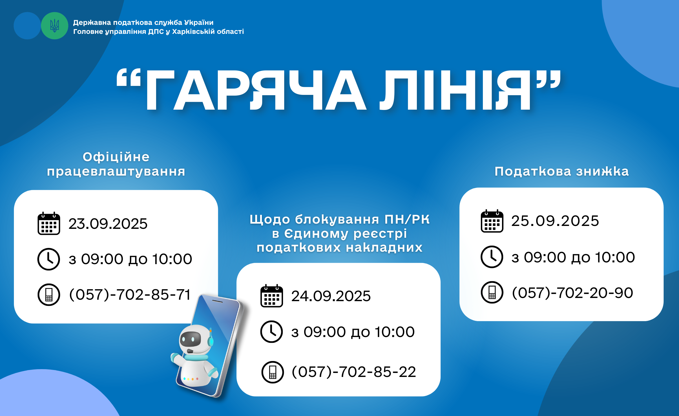 24 вересня 2025 року з 09-00 до 10-00 відбудеться сеанс телефонного зв’язку «гаряча лінія» на тему: «Щодо блокування ПН/РК в Єдиному реєстрі податкових накладних».