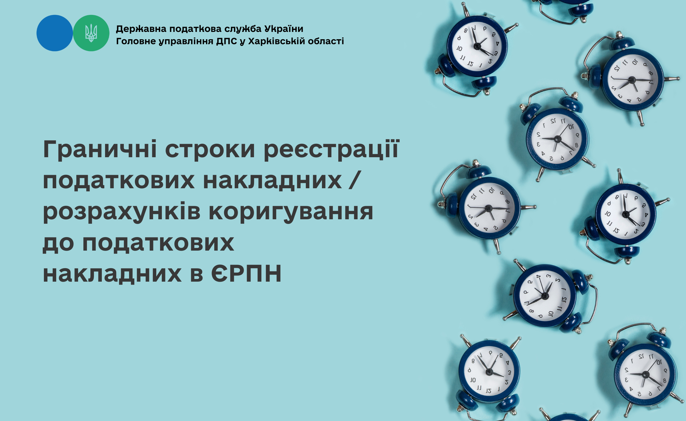 Головне управління ДПС у Харківській області інформує, що тимчасово, протягом дії воєнного стану в Україні та шести місяців після місяця, в якому воєнний стан буде припинено або скасовано, реєстрація податкових накладних та/або розрахунків коригування до податкових накладних у Єдиному реєстрі податкових накладних здійснюється з урахуванням таких граничних строків:
