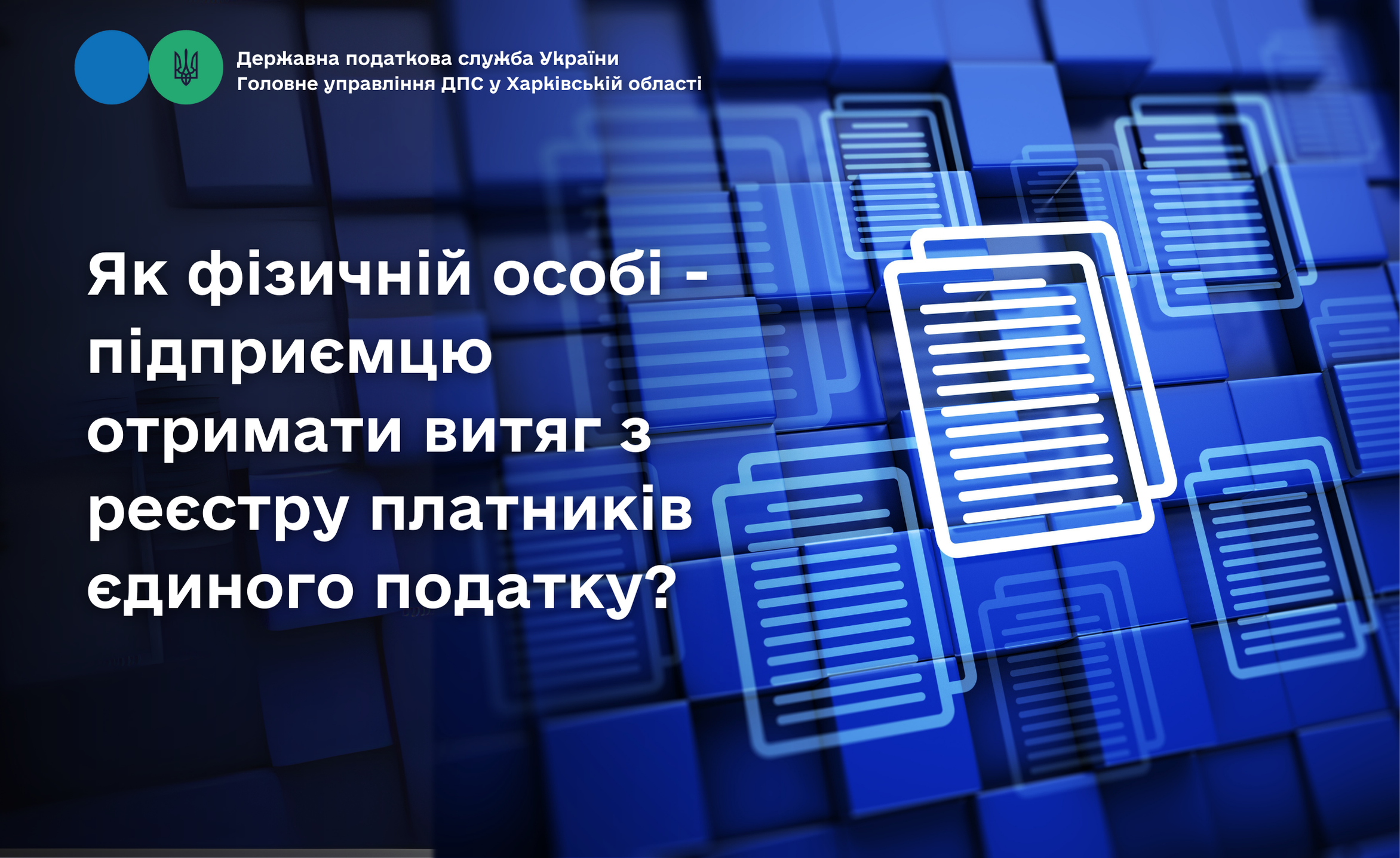 Головне управління ДПС у Харківській області інформує, що відповідно до п. 299.9 ст. 299 Податкового кодексу України фізична особа – підприємець, зареєстрований платником єдиного податку, має можливість подати запит про отримання витягу з реєстру платників єдиного податку до контролюючого органу за місцем податкової адреси в один із таких способів: