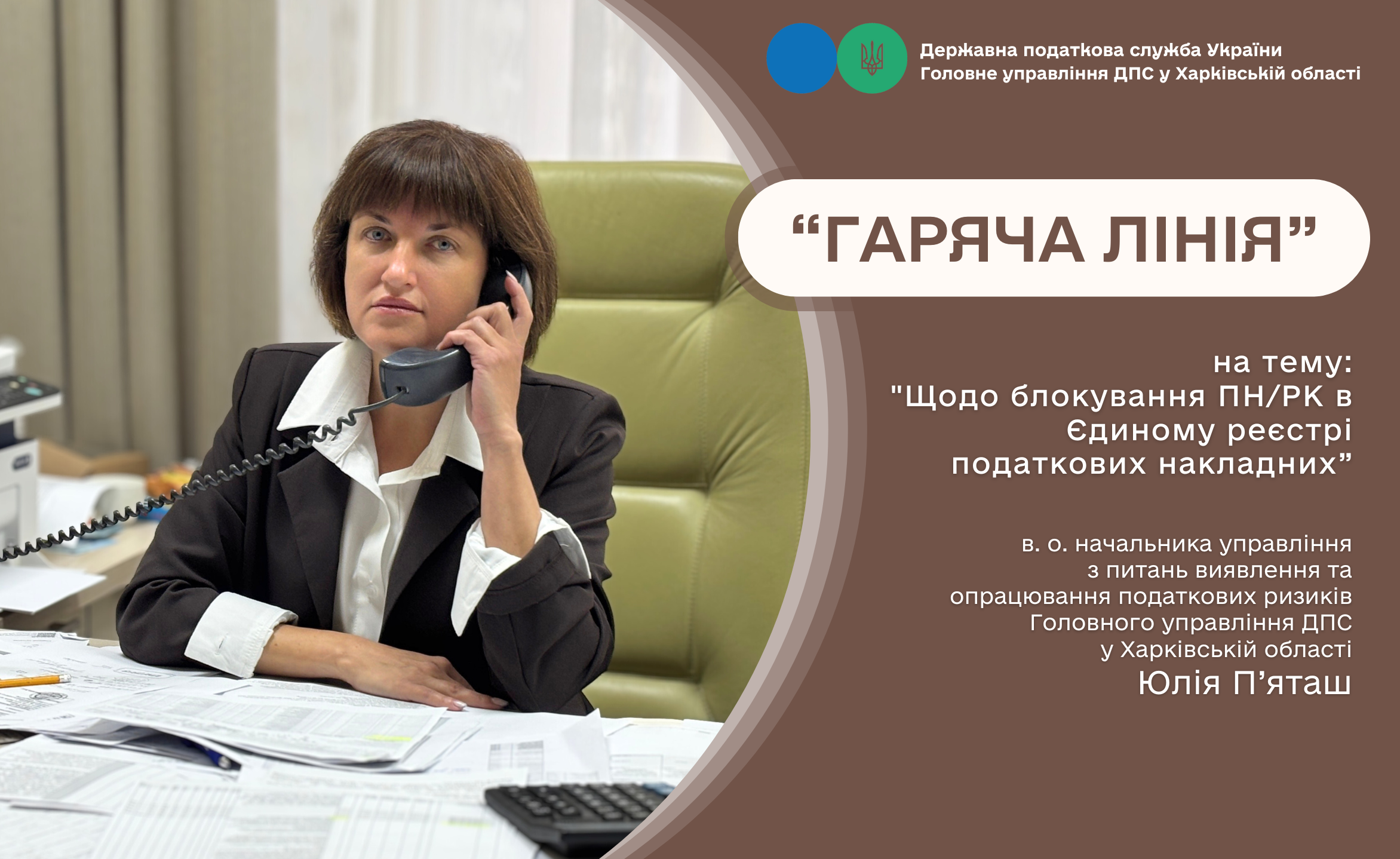 В. о. начальника управління з питань виявлення та опрацювання податкових ризиків Головного управління ДПС у Харківській області Юлія П`яташ провела черговий сеанс телефонного зв’язку «гаряча лінія» на тему: «Щодо блокування податкових накладних/розрахунків коригування в Єдиному реєстрі податкових накладних».