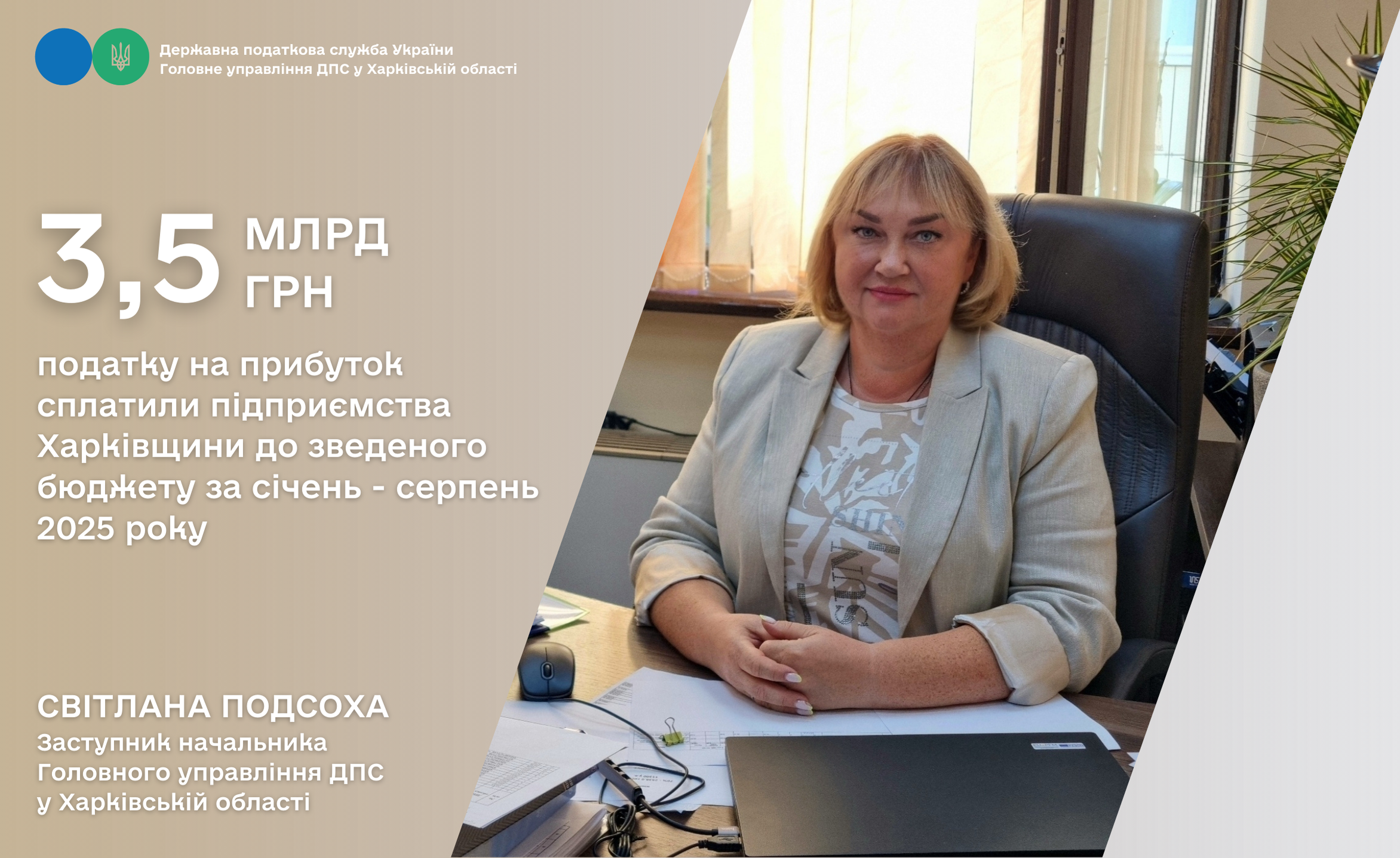 Як зазначила заступник начальника Головного управління ДПС у Харківській області Світлана Подсоха, підприємства Харківщини за 8 місяців 2025 року сплатили до зведеного бюджету 3 532,5 млн грн податку на прибуток, що становить 124,2 % планових показників. Додатково бюджет отримав 688 млн гривень. У порівнянні з надходженнями за відповідний період минулого року додатково отримано 951,9 млн грн.