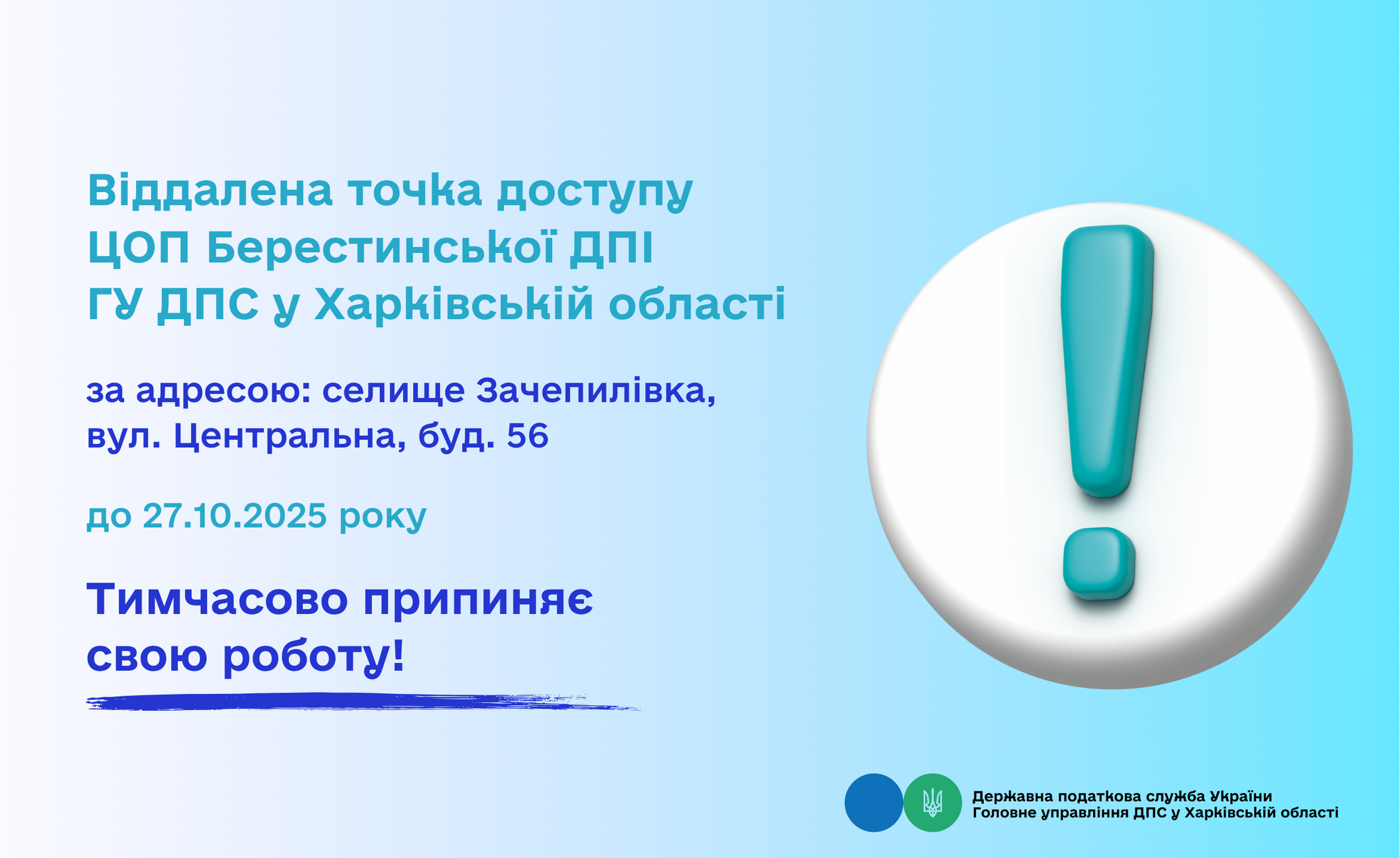 Віддалена точка доступу ЦОП Берестинської ДПІ за адресою селище Зачепилівка, вул. Центральна, буд. 56 тимчасово припиняє свою роботу до 27.10.2025 року.