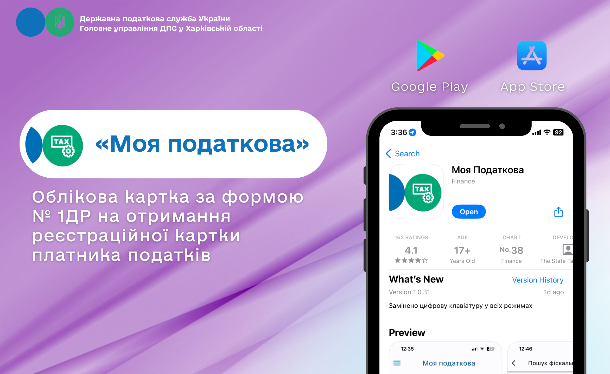 Головне управління ДПС у Харківській області інформує, що для використання мобільного застосунку «Моя податкова» фізичній особі необхідно завантажити застосунок «Моя податкова» в AppStore або GooglePlay.