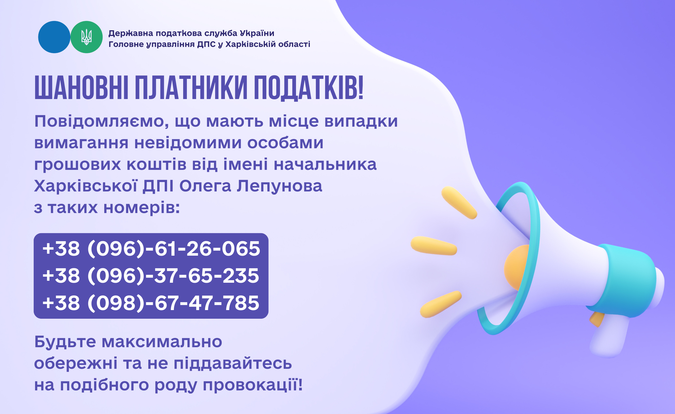 У разі таких телефонних дзвінків не замовчуйте факти, негайно телефонуйте на Антикорупційний сервіс ДПС України «Пульс» за тел. 0-800-501-007  (напрям 5) та до правоохоронних органів.