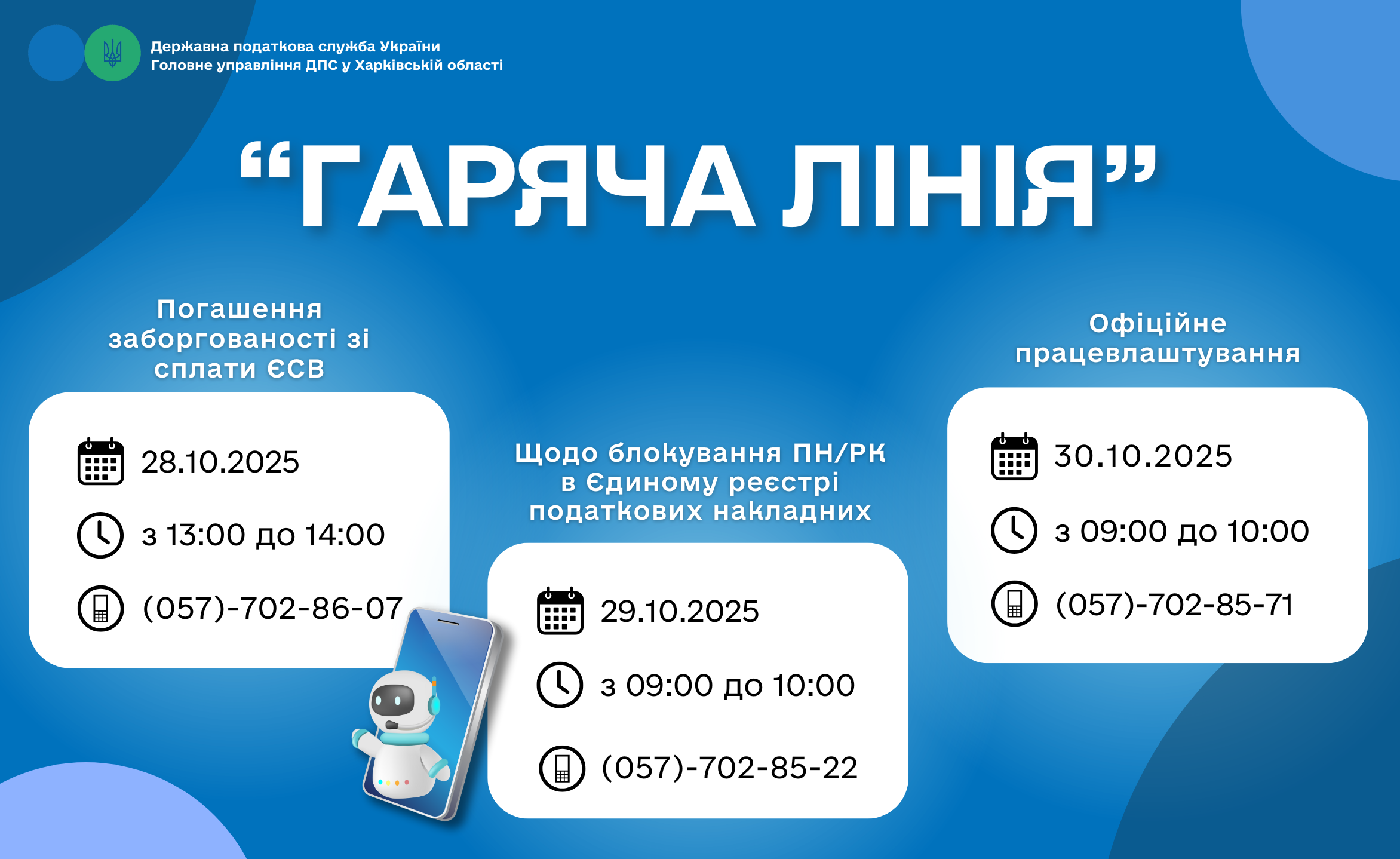29 жовтня 2025 року з 09-00 до 10-00 відбудеться сеанс телефонного зв’язку «гаряча лінія» на тему: «Щодо блокування ПН/РК в Єдиному реєстрі податкових накладних».