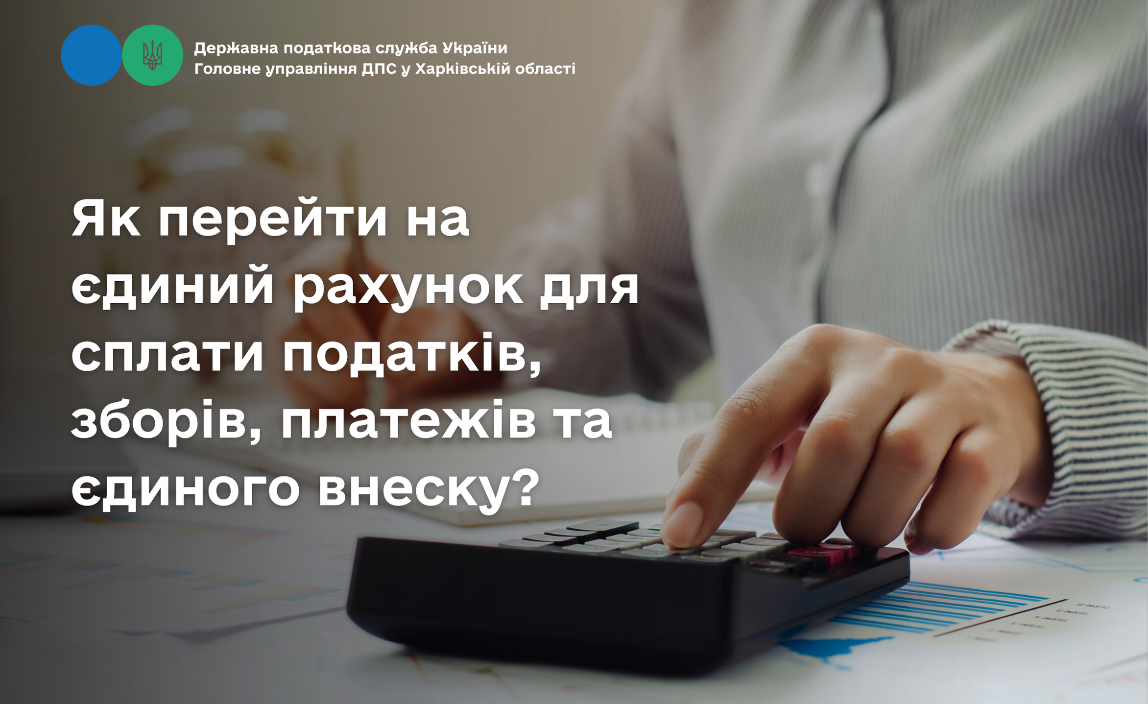 Головне управління ДПС у Харківській області інформує, що платники податків мають можливість використовувати для сплати грошових зобов’язань чи податкового боргу з податків та зборів, єдиного внеску та інших платежів Єдиний рахунок - рахунок, відкритий у Державній казначейській службі України.