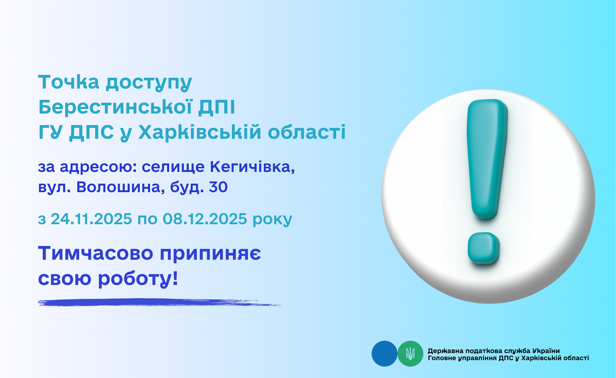 Платники податків мають змогу отримати необхідні послуги: в ЦОП Берестинської ДПІ за адресою: м. Берестин, вул. Короленко, 85. (тел. 057-44-7-13-62) та в пункті обслуговування за адресою: селище Сахновщина, вул. Шмідта, буд. 10 (тел 057-62-3-26-54).