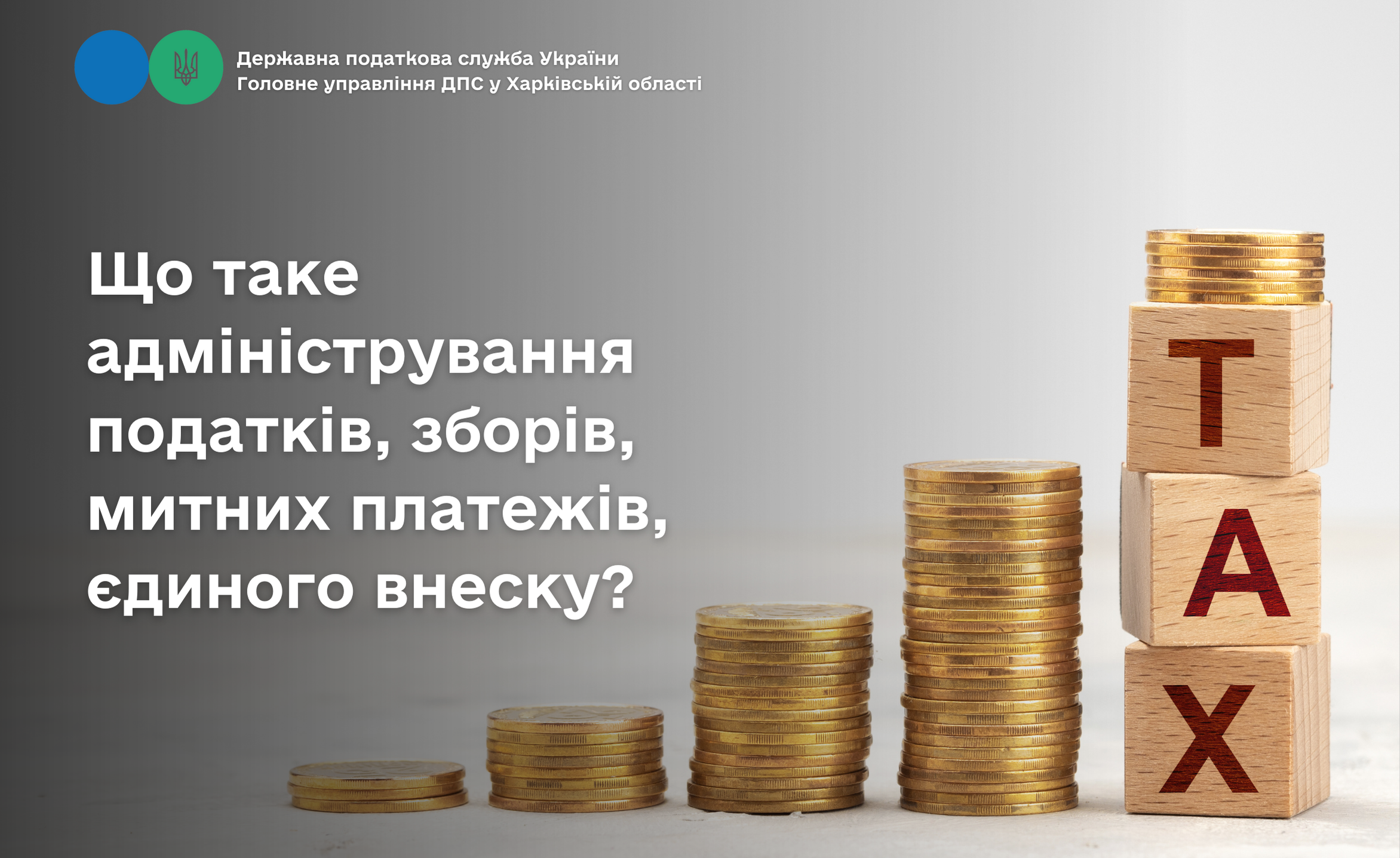 Головне управління ДПС у Харківській області інформує, що відповідно до п.п. 14.1.11 п. 14.1 ст. 14 Податкового кодексу України адміністрування податків, зборів, митних платежів, єдиного внеску на загальнообов’язкове державне соціальне страхування (далі - єдиний внесок) та інших платежів відповідно до законодавства, контроль за дотриманням якого покладено на контролюючі органи (далі - податків, зборів, платежів) - це сукупність рішень та процедур контролюючих органів і дій їх посадових осіб, що визначають інституційну структуру податкових та митних відносин, організовують ідентифікацію, облік платників податків і платників єдиного внеску та об’єктів оподаткування, забезпечують сервісне обслуговування платників податків, організацію та контроль за сплатою податків, зборів, платежів відповідно до порядку, встановленого законом.
