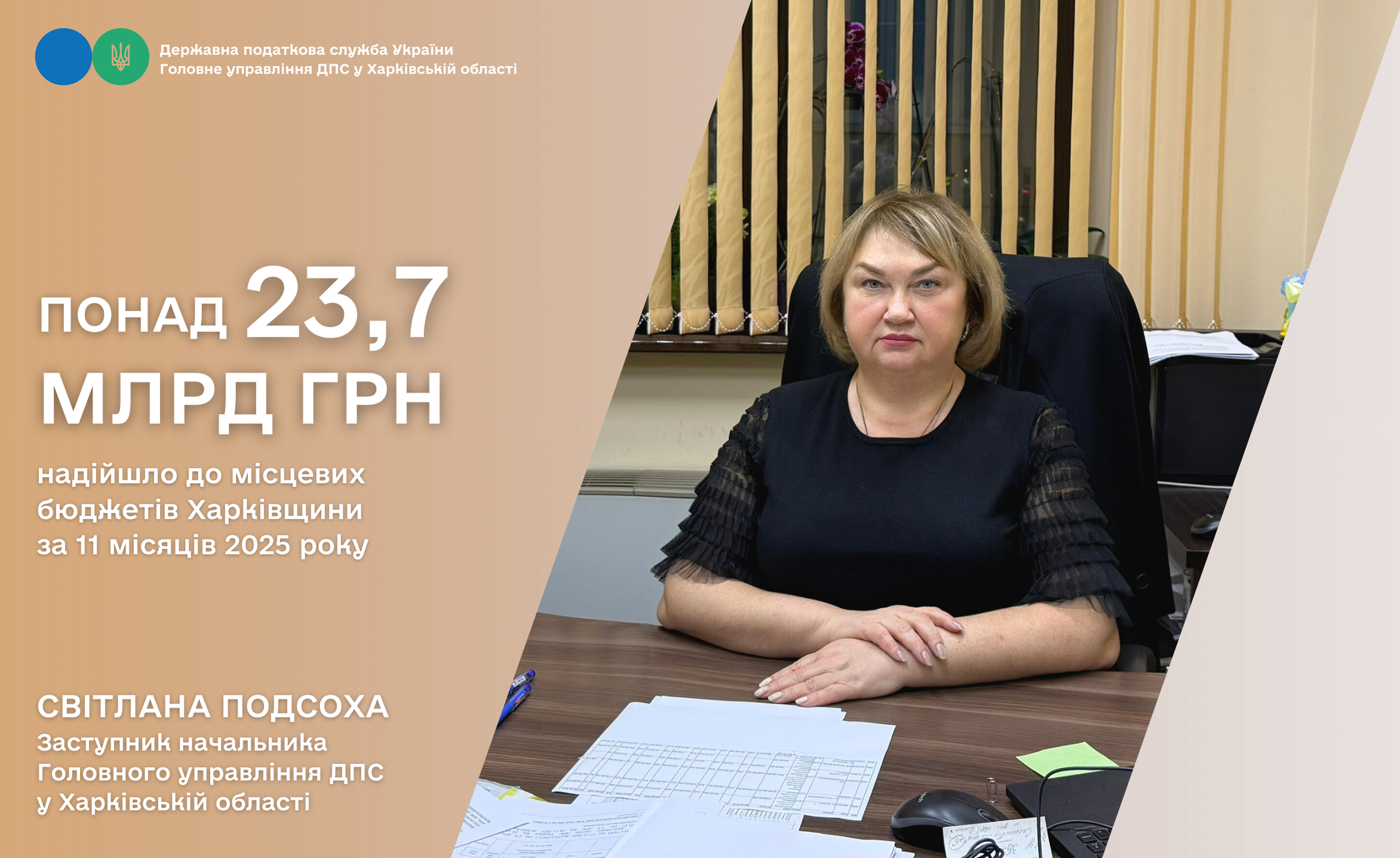 За її словами до місцевих бюджетів за січень – листопад 2025 року від платників податків надійшло 23 709,4 млн грн, що на 12,2 % або на 2 580 млн грн більше минулорічного показника.