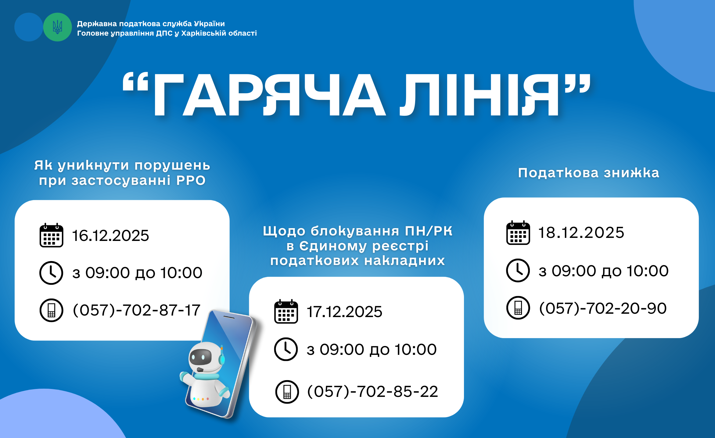 16 грудня 2025 року з 09-00 до 10-00 відбудеться сеанс телефонного зв’язку «гаряча лінія» на тему: «Як уникнути порушень при застосуванні РРО».