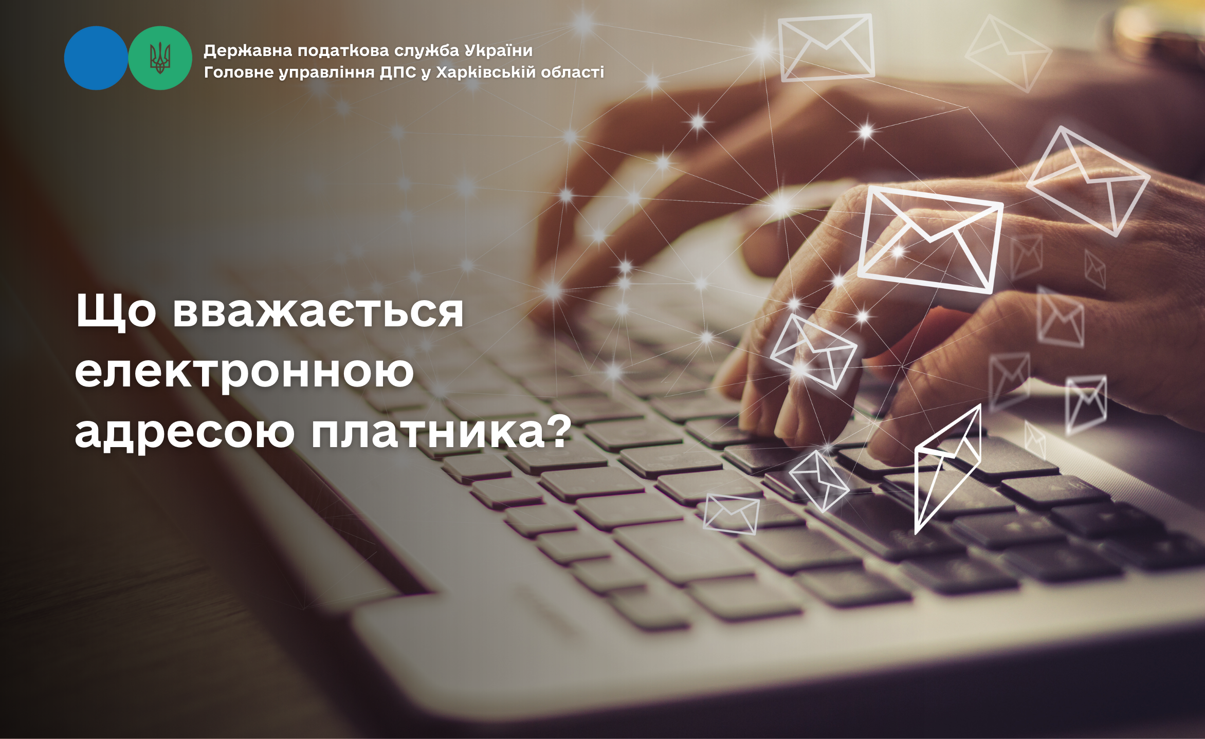 Головне управління ДПС у Харківській області інформує, що відповідно до п.п. 14.1.56 п. 14.1 ст. 14 Податкового кодексу України електронна адреса – це адреса електронної пошти платника податків, що складається з ідентифікатора, позначки "@" та доменного імені, що використовується платником податків для листування з державними, у тому числі контролюючими, органами та повідомляється шляхом внесення адреси електронної пошти до облікових даних платника податків, зокрема в електронному кабінеті.