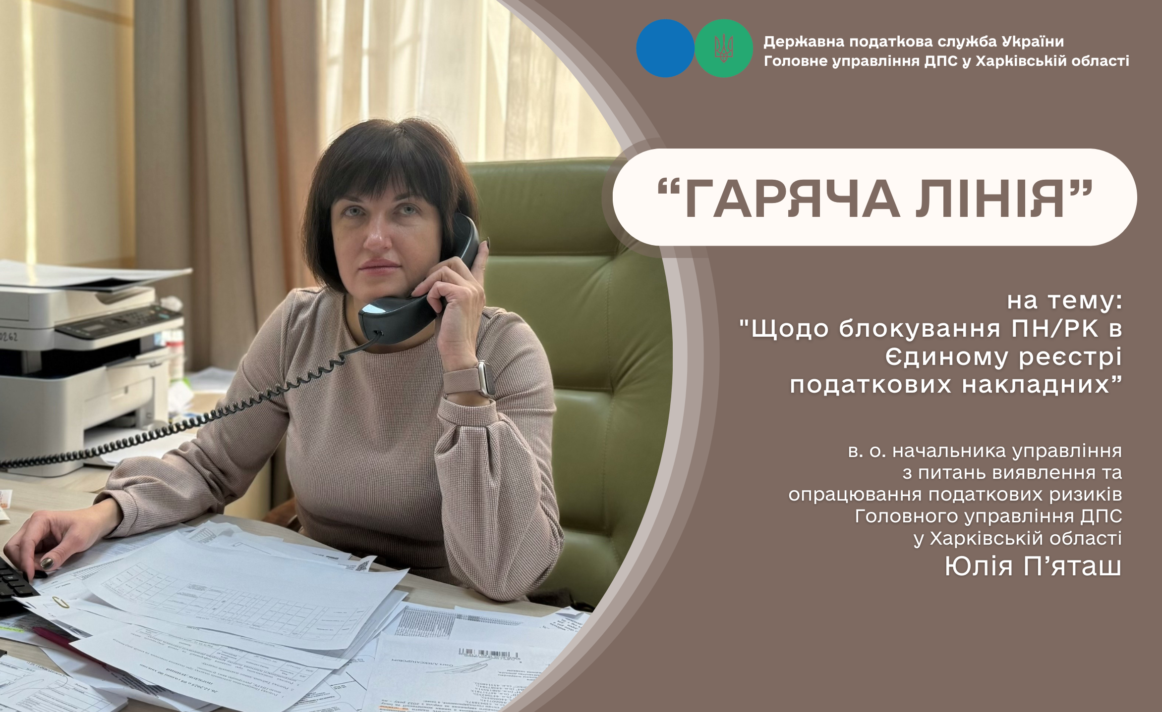 В. о. начальника управління з питань виявлення та опрацювання податкових ризиків Головного управління ДПС у Харківській області Юлія П`яташ відповіла на запитання платників податків щодо блокування податкових накладних під час чергової телефонної «гарячої лінії».
