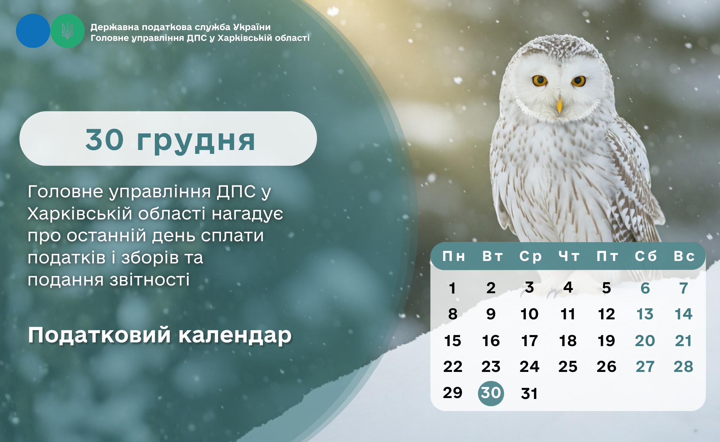 Головне управління ДПС у Харківській області повідомляє, що 30 грудня 2025: