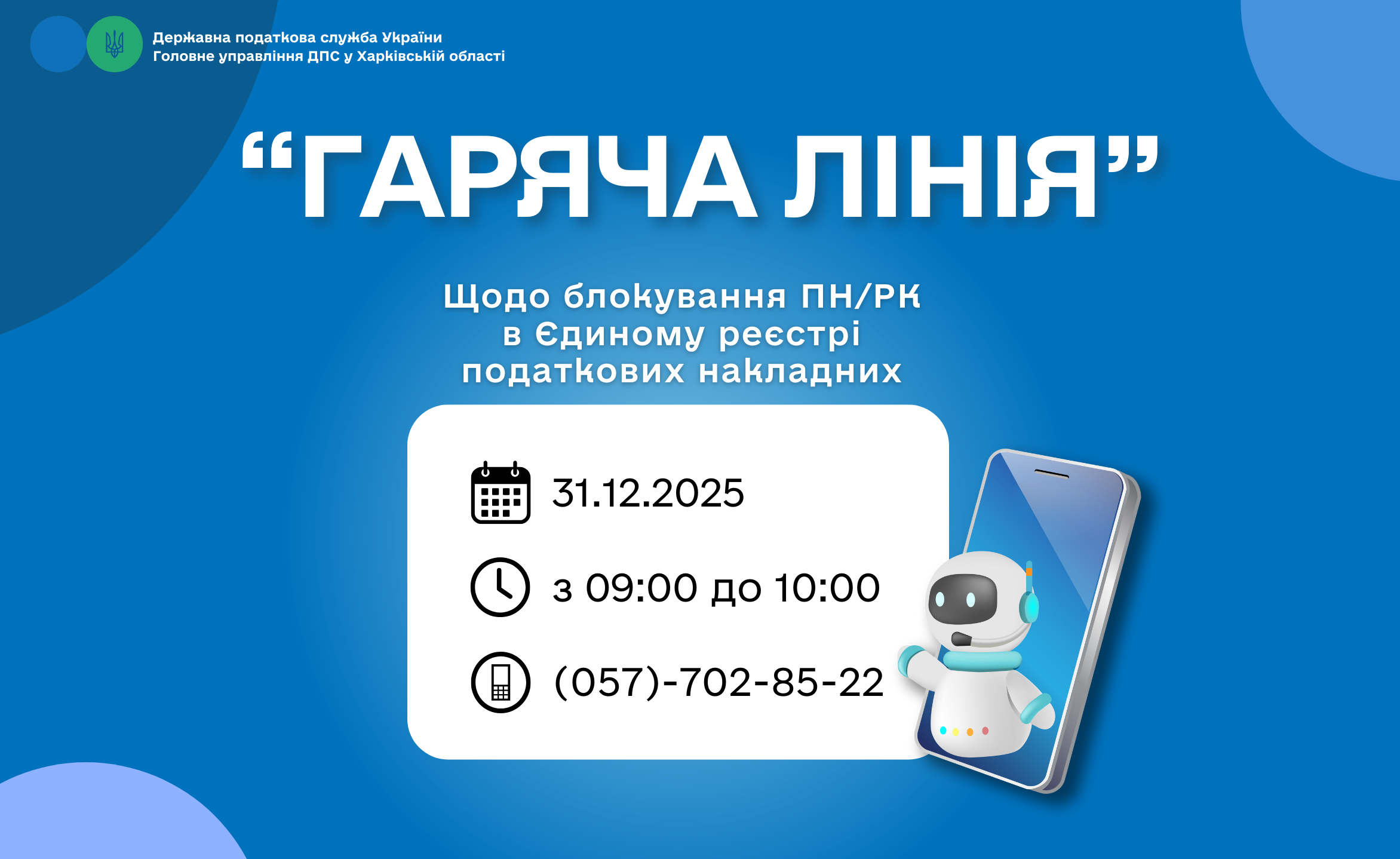 Анонс «гарячих ліній» Головного управління ДПС у Харківській області з 29.12.2025 по 31.12.2025