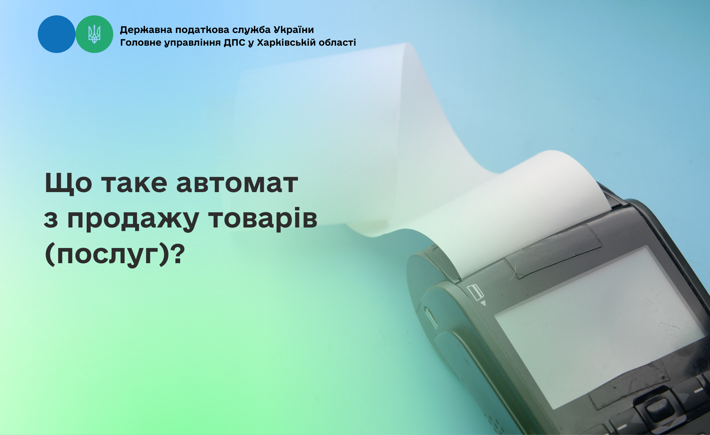 Головне управління ДПС у Харківській області повідомляє, що відповідно до ст. 2 Закону України від 06 липня 1995 року № 265/95-ВР «Про застосування реєстраторів розрахункових операцій у сфері торгівлі, громадського харчування та послуг» із змінами, автомат з продажу товарів (послуг) – реєстратор розрахункових операцій, який в автоматичному режимі здійснює видачу (надання) за готівкові кошти або із застосуванням платіжних карток, жетонів тощо товарів (послуг) і забезпечує відповідний облік їх кількості та вартості, та створює контрольну стрічку в електронному вигляді.