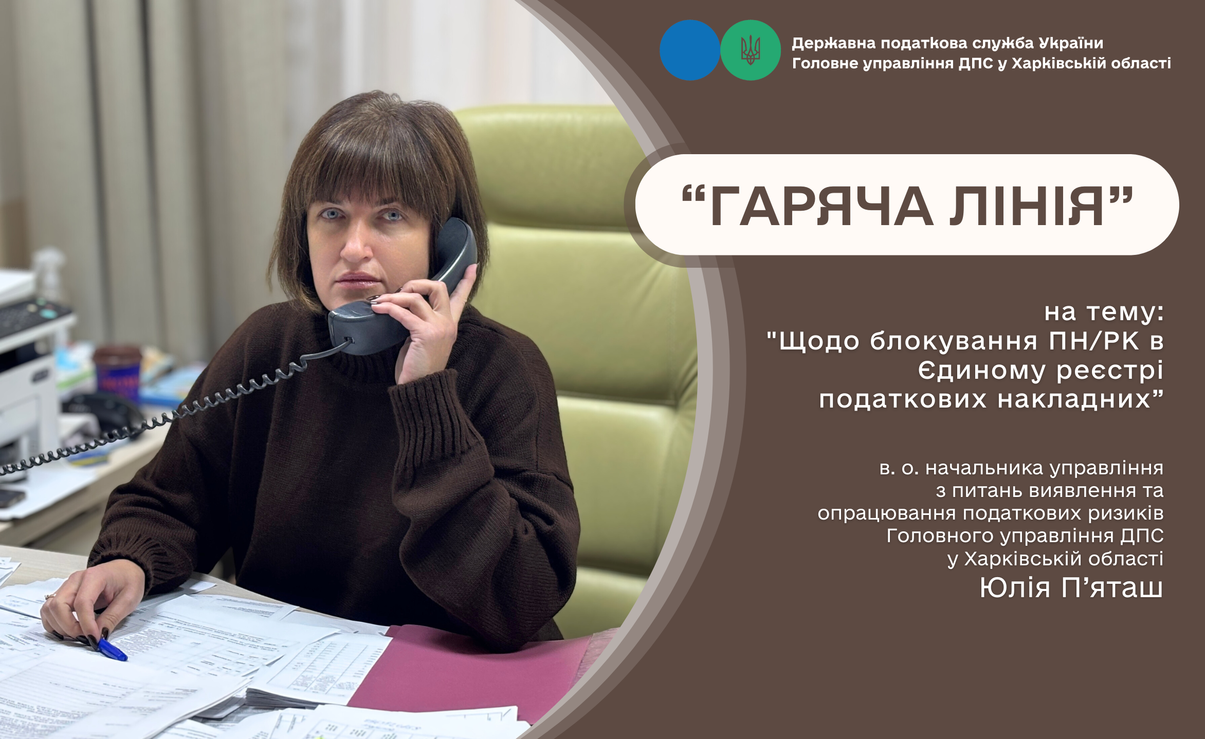 Питанням блокування податкових накладних в Єдиному реєстрі /розрахунків коригування до податкових накладних (ПН/РК) в Єдиному реєстрі податкових накладних (ЄРПН) була присвячена «гаряча лінія» у Головному управлінні ДПС у Харківській області. З платниками податків спілкувалася в.о. начальника управління з питань виявлення та опрацювання податкових ризиків ГУ ДПС Юлія П`яташ.