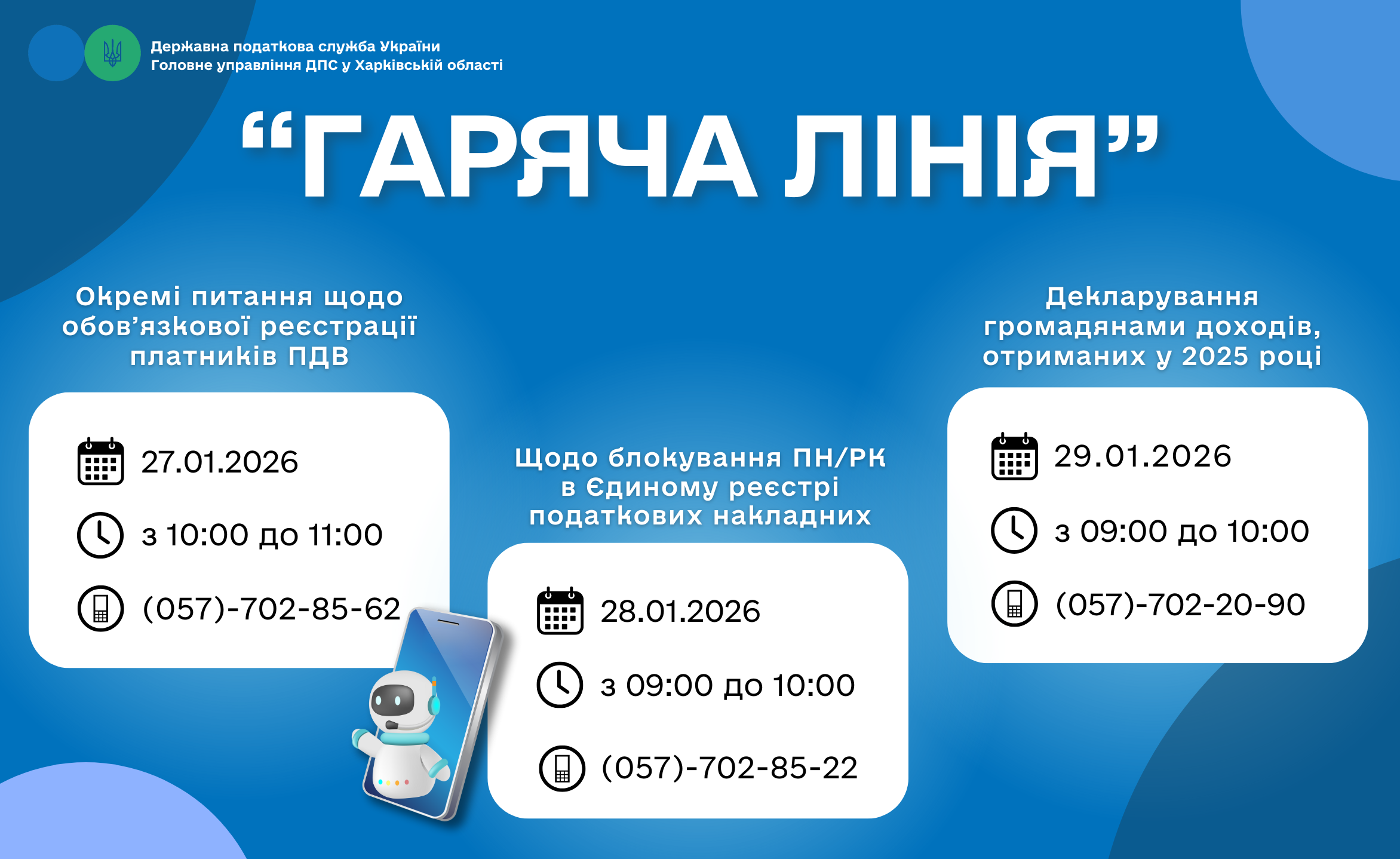 Анонс «гарячих ліній» Головного управління ДПС у Харківській області з 26.01.2026 по 30.01.2026