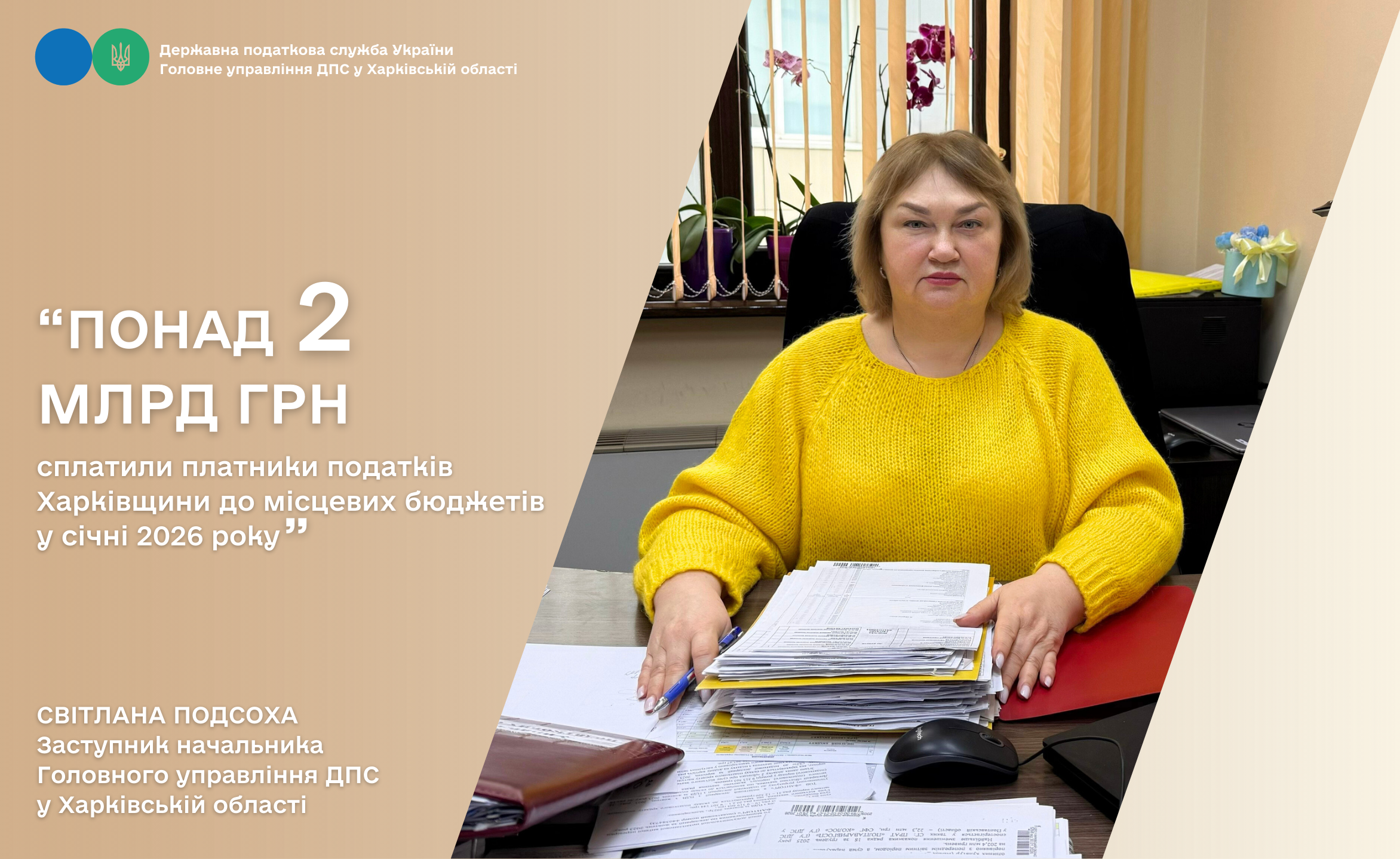 За січень 2026 року платники податків Харківщини перерахували до місцевих бюджетів 2 286,7 млн грн податків і зборів. Як зазначила заступник начальника Головного управління ДПС у Харківській області Світлана Подсоха, це на 14,8 % або на 294,1 млн грн більше минулорічного показника.