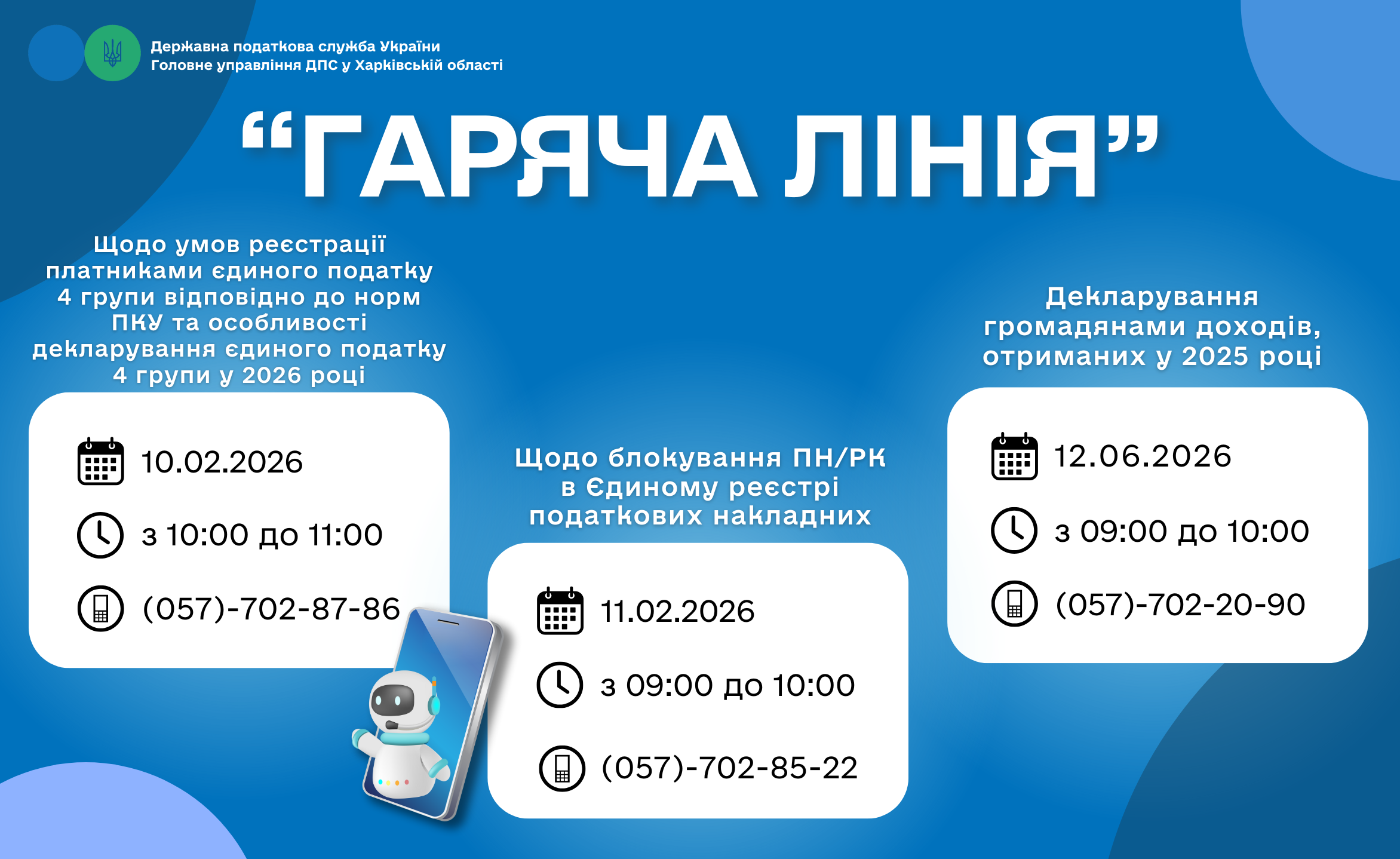 Анонс «гарячих ліній» Головного управління ДПС у Харківській області з 09.02.2026 по 13.02.2026