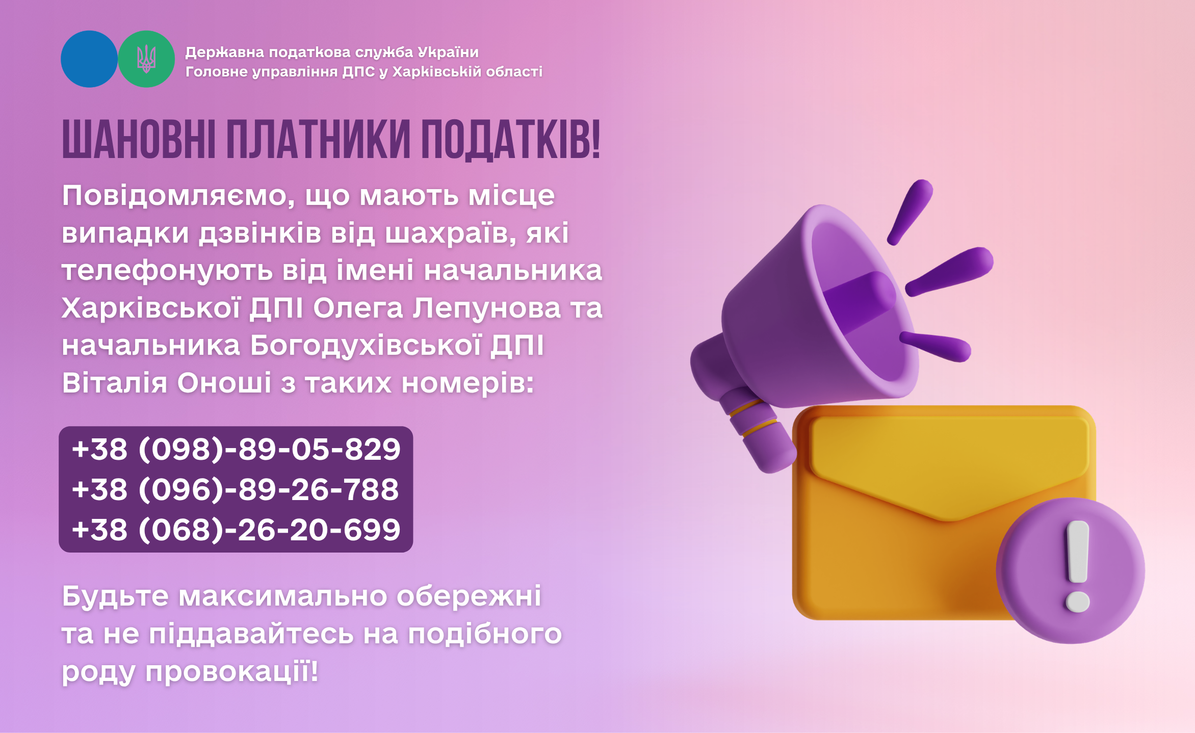 Головне управління ДПС у Харківській області повідомляє, що від СВК ім. В.Н. Каразіна надійшла інформація про те, що невідомі особи, телефонуючи з номерів: +38 (098)-89-05-829, +38 (096)-89-26-788 та +38 (068)-26-20-699, представляються керівником Харківської ДПІ Олегом Лепуновим та пропонують зателефонувати начальнику Богодухівської ДПІ Віталію Оноші за номером +38 (068)-26-20-699 для «вирішення питань».