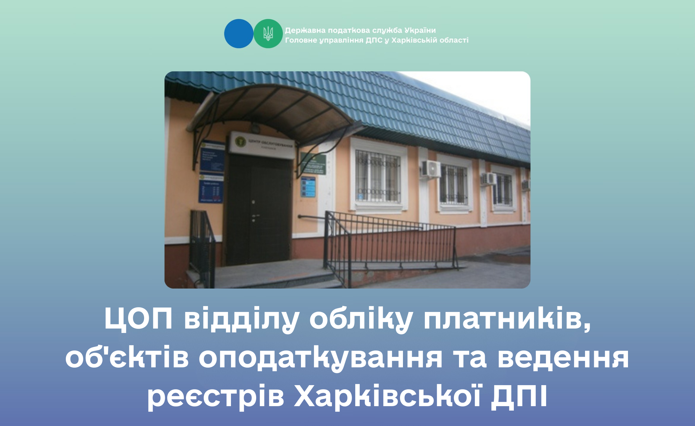 Головне управління ДПС у Харківській області повідомляє, що точка доступу ЦОП Харківської ДПІ за адресою: м. Харків, пров. Академіка Підгорного, 3 тимчасово припиняє надання адміністративних послуг з 10.11.2025 р. по 01.12.2025 р. в частині: