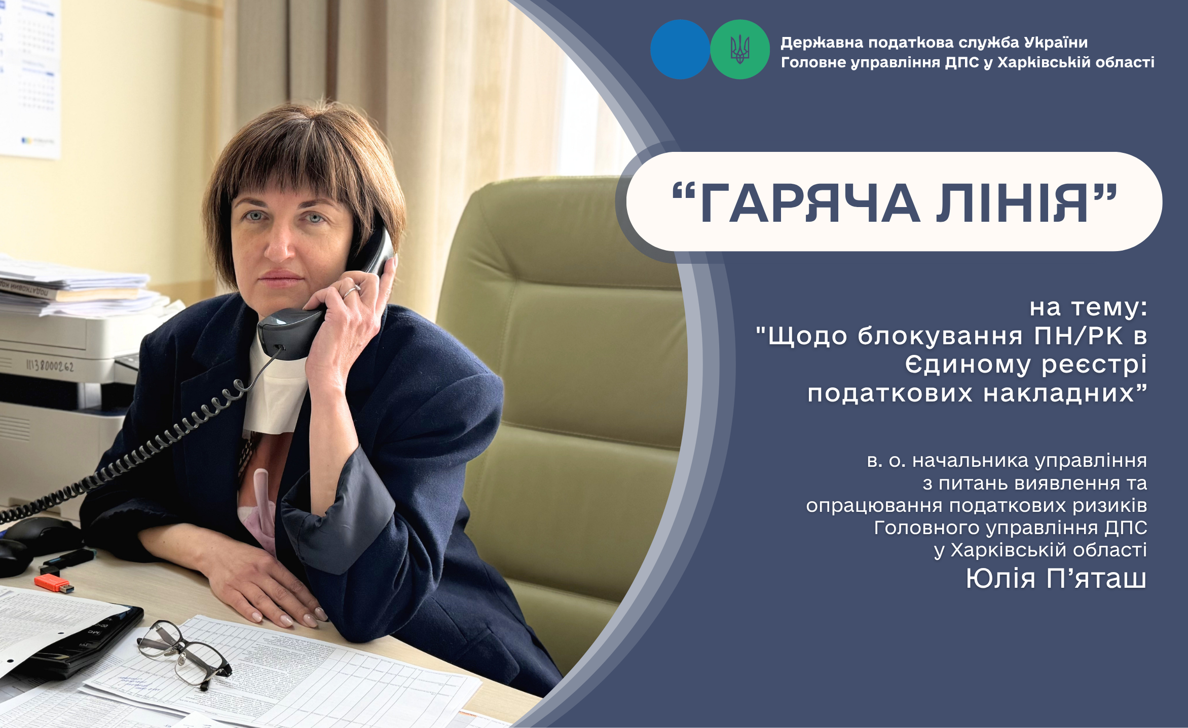У Головному управлінні ДПС у Харківській області відповіли на запитання платників податків щодо блокування податкових накладних та розрахунків коригування в Єдиному реєстрі податкових накладних під час телефонної «гарячої лінії». Консультувала в.о. начальника управління з питань виявлення та опрацювання податкових ризиків ГУ ДПС у Харківській області Юлія П’яташ.