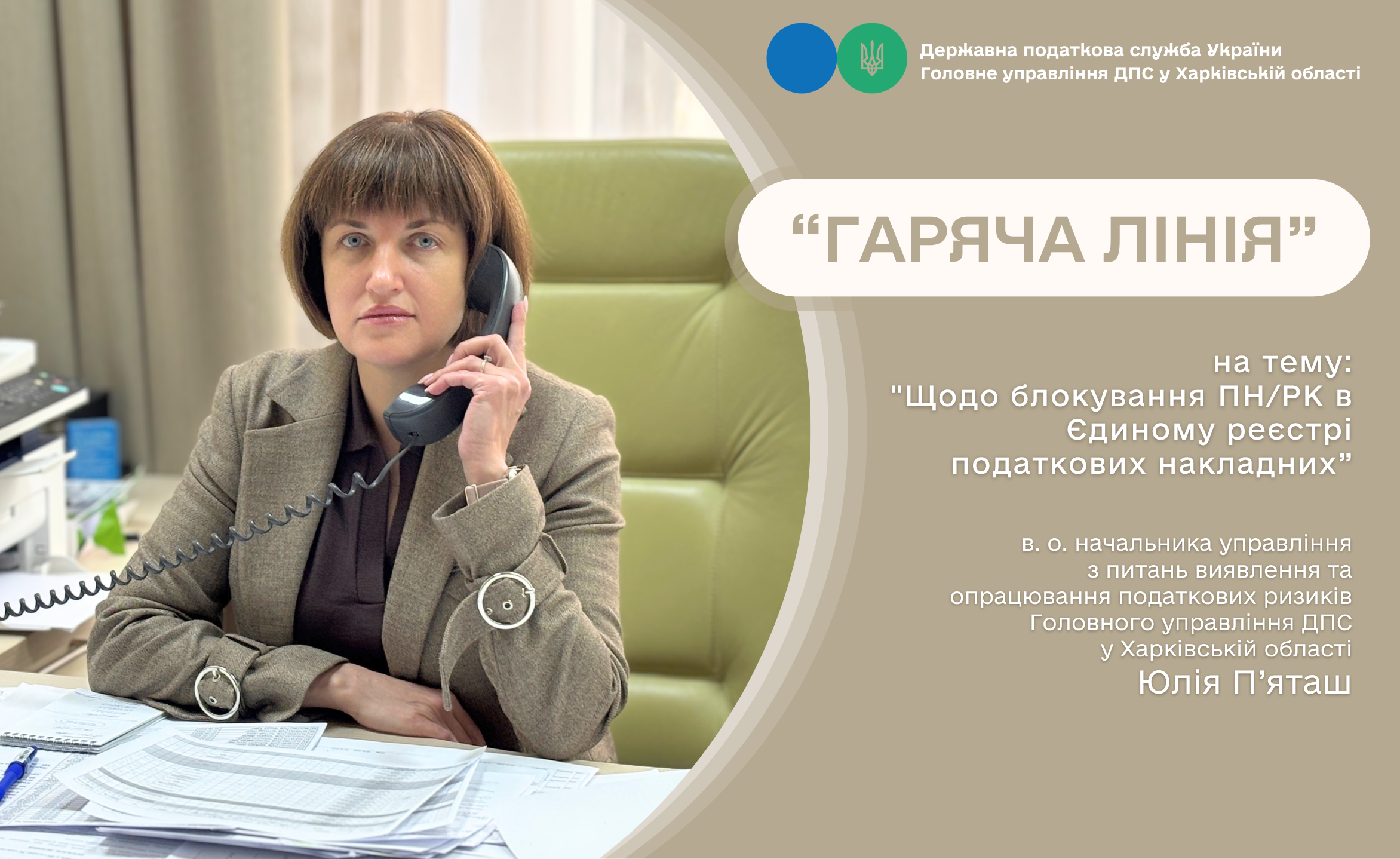 У Головному управлінні ДПС у Харківській області проведено сеанс телефонного зв’язку «гаряча лінія» з питань блокування податкових накладних/розрахунків коригування в ЄРПН. На запитання платників податків відповідала в.о. начальника управління з питань виявлення та опрацювання податкових ризиків ГУ ДПС Юлія П`яташ.