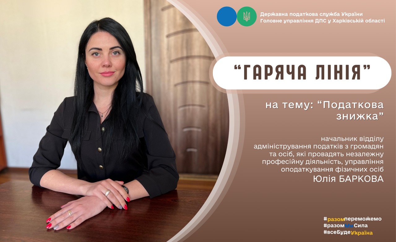 У Головному управлінні ДПС у Харківській області начальником відділу адміністрування податків з громадян та осіб, які провадять незалежну професійну діяльність, управління оподаткування фізичних осіб Головного управління ДПС у Харківській області Юлією Барковою проведено черговий сеанс телефонного зв’язку «гаряча лінія» на тему: «Податкова знижка».