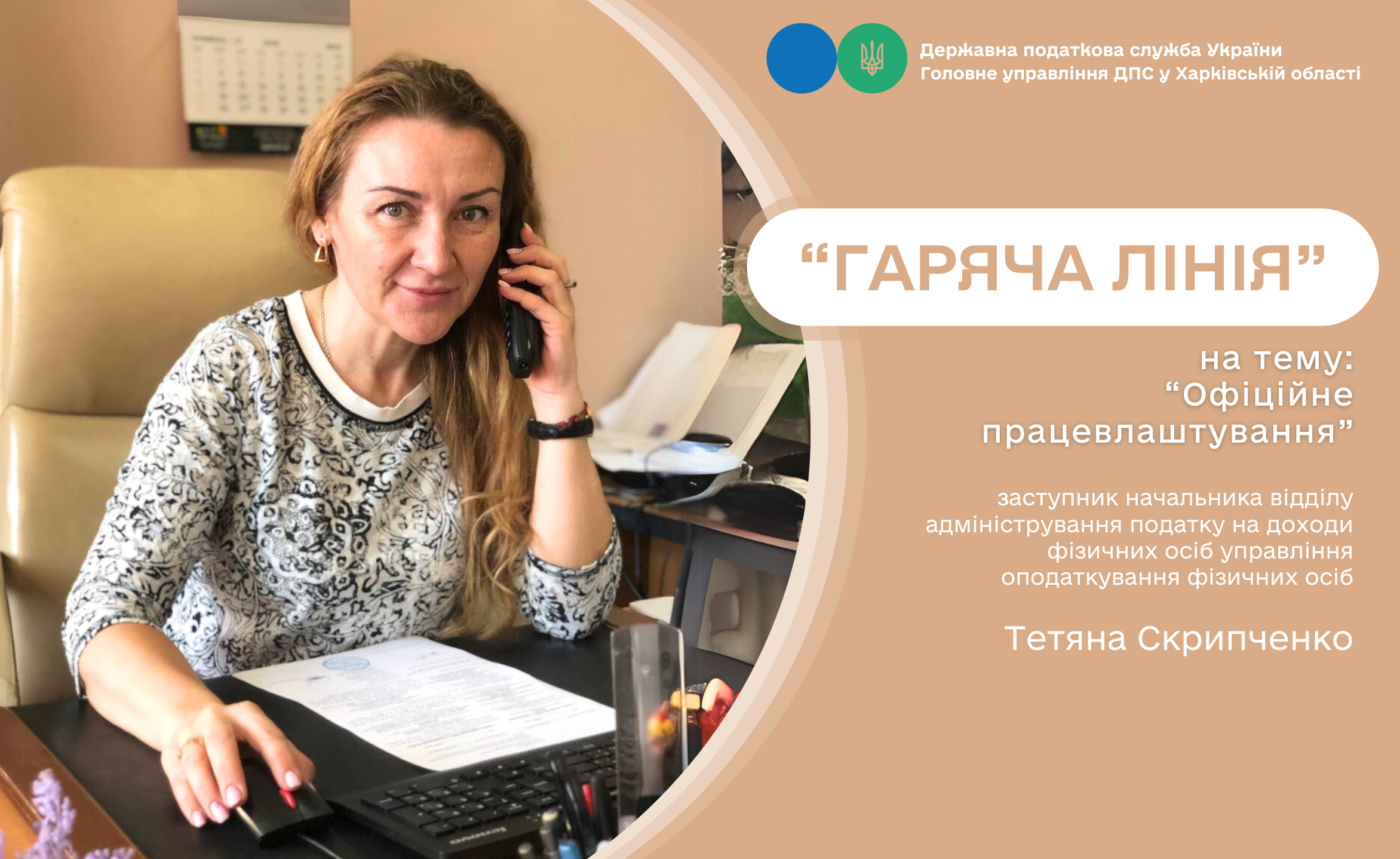 Заступник начальника відділу адміністрування податку на доходи фізичних осіб управління оподаткування фізичних осіб Головного управління ДПС у Харківській області Тетяна Скрипченко провела черговий сеанс телефонного зв’язку «гаряча лінія» на тему: «Офіційне працевлаштування».