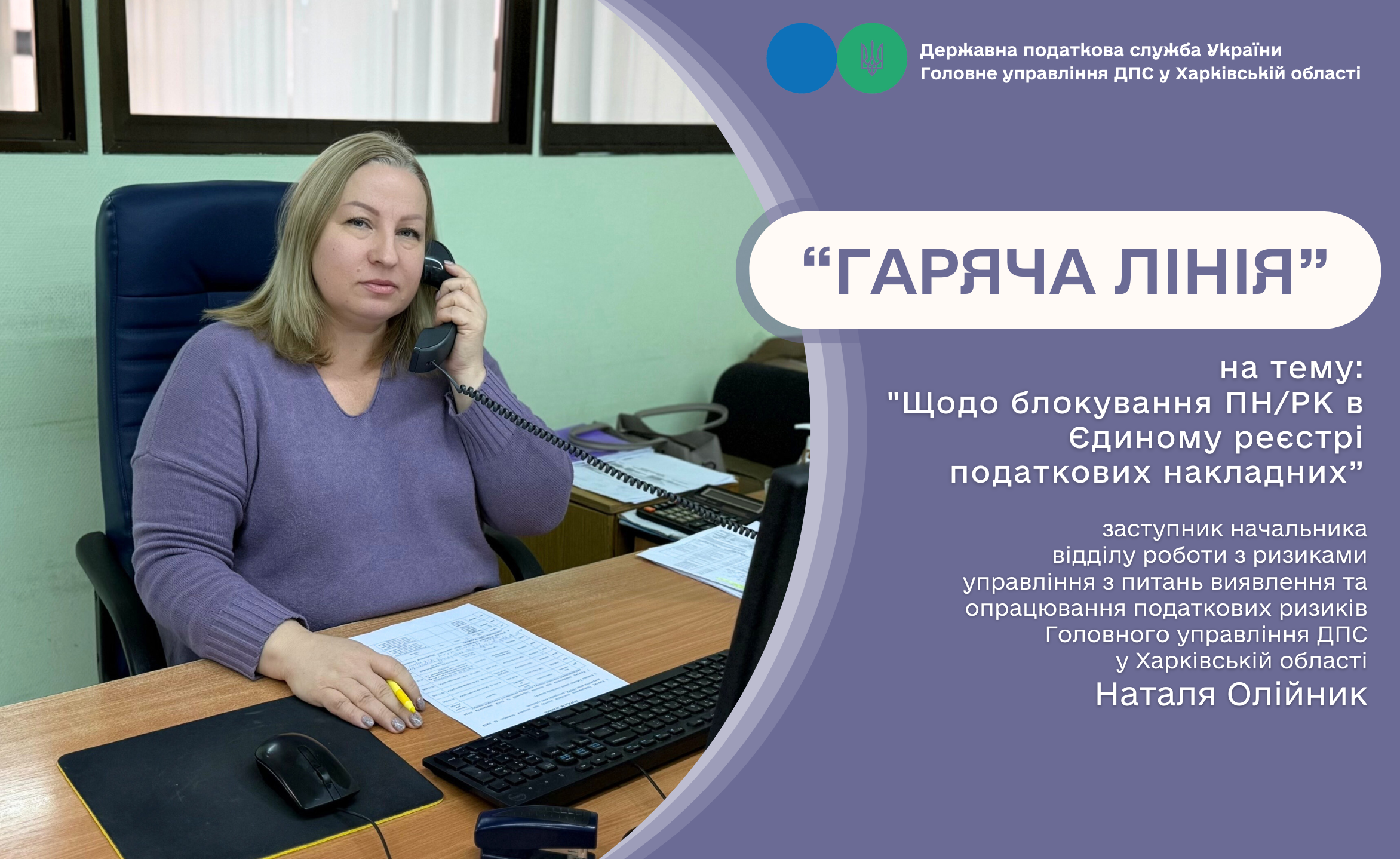 У Головному управлінні ДПС у Харківській області проведена чергова телефонна «гаряча лінія» з питань блокування податкових накладних та розрахунків коригування в Єдиному реєстрі податкових накладних. На запитання платників податків відповіла заступник начальника відділу роботи з ризиками управління з питань виявлення та опрацювання податкових ризиків ГУ ДПС у Харківській області Наталя Олійник.