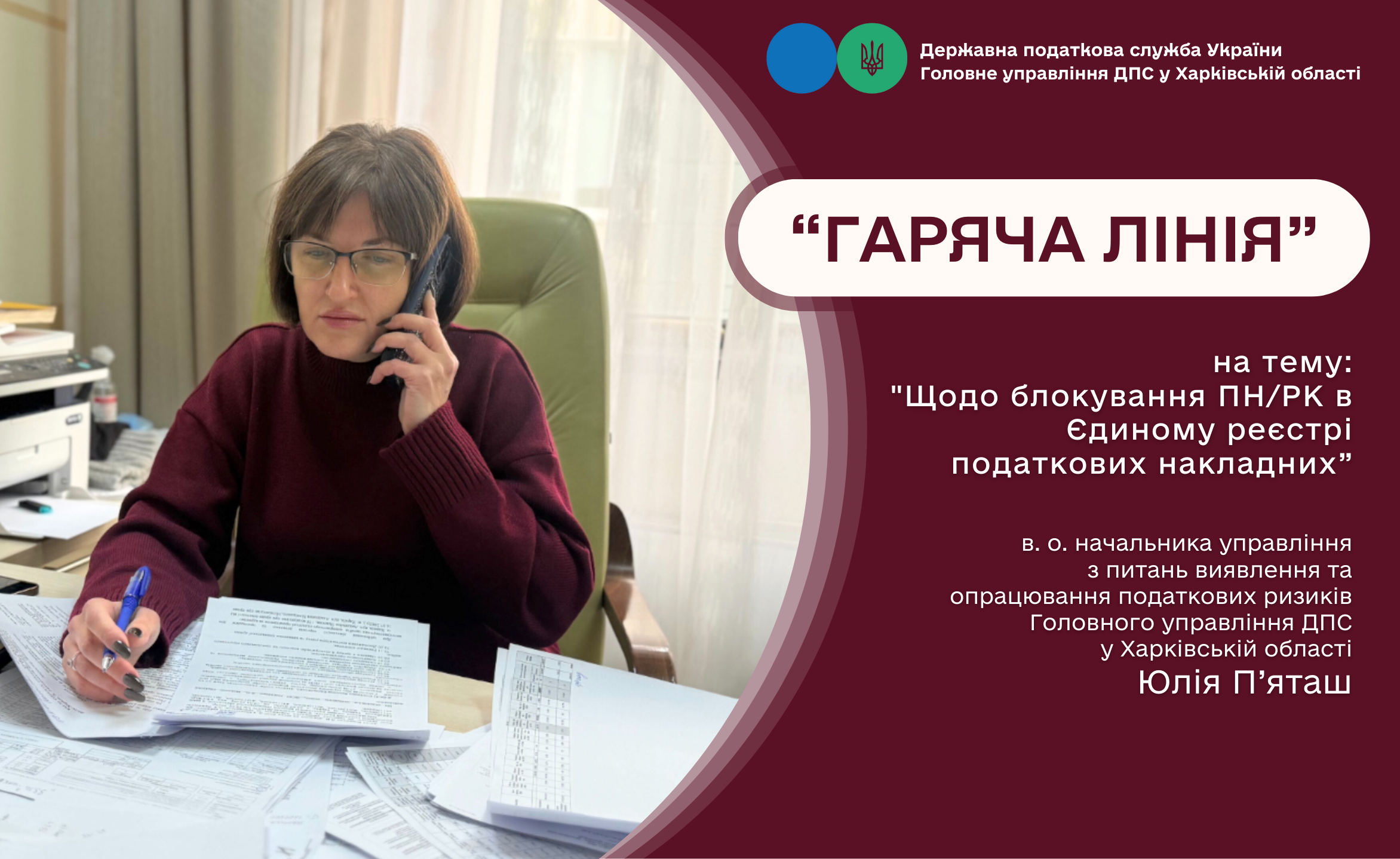 Юлія П`яташ відповіла на всі запитання платників податків та рекомендувала у разі виникнення запитань у подальшому звертатися до Консультаційного центру Головного управління ДПС у Харківській області з питань зупинення реєстрації податкової накладної/розрахунку коригування в ЄРПН.